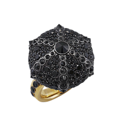 Sea urchin ring with burnished white gold head with black diamonds and yellow gold shank