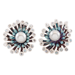The delicate stems of green and purple titanium, topped with diamond stamens, enhance the central pearls light, capturing its magical reflections.