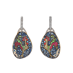 Miniatura earrings with a diamond rooster, tail of tsavorites and rubies on a sapphire pavé, set in 18kt yellow gold