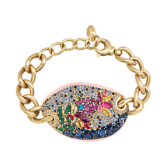 Miniature Fish Bracelet in 18kt yellow gold, diamonds, blue, yellow and pink sapphires, ruby, emeralds, pink enamel