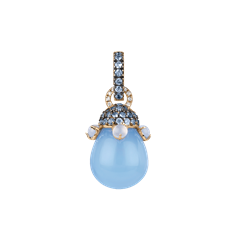 Joyful charm in 18kt yellow gold, diamonds, blue light sapphires and pearls in wisteria-colored crystal.