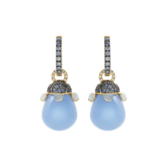Joyful earrings in 18kt yellow gold, diamonds, blue light sapphires and pearls in wisteria-colored crystal.