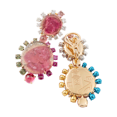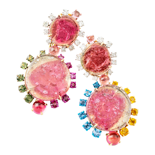 Le tormaline tagliate parallelamente al prisma originario, risplendono contornate da zaffiri gialli, blu e verdi che ne enfatizzano i colori.