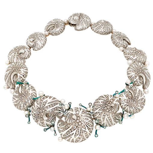 Quattordici valve iridescenti di Nautilus occhieggiano magiche tra rami di titanio colorato. Un accostamento sapiente e raffinato, la combinazione quasi allegorica e preziosa di smalto bianco e diamanti rivela luci, tonalità e suggestioni del mare d'inverno e impalpabili chiaroscuri degli abissi. Il mito ellenico si sovrappone alle immagini fotografiche di Ansel Adam, Moholy Nagy e Paul Strand, evocando le conchiglie rare ed esotiche custodite come veri tesori nelle Wunderkammer dei principi barocchi.