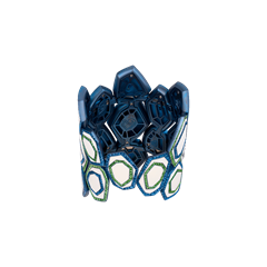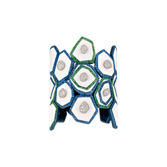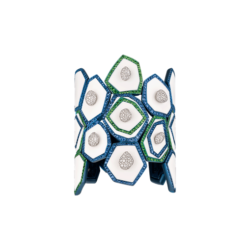 Un pavé di tasselli di smalto bianco color latte, contornati da smeraldi e zaffiri in una costruzione ardita realizzata in titanio, danno vita ad un cuff unico e facilmente indossabile.